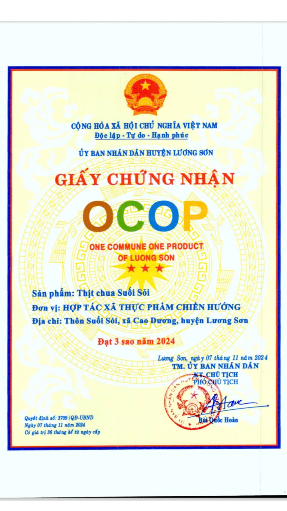 Thịt chua Suối Sỏi không chỉ là món ăn ngon mà còn là sản phẩm đạt chuẩn OCOP 3*, được kiểm nghiệm và chứng nhận đạt tiêu chuẩn của Bộ Y Tế. Sản phẩm được sản xuất từ nguyên liệu tươi ngon, đảm bảo an toàn vệ sinh thực phẩm, mang đến sự yên tâm tuyệt đối cho người tiêu dùng.